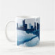 Uma paisagem urbana azul e sombria refletida em terreno montanhoso selvagem.