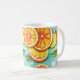 Esta caneca clássica apresenta um design cítrico ousado e vibrante com fatias suculentas de laranja, limão e lima ilustradas em um estilo moderno e animado. Contra um fundo azul-turquesa brilhante com acentos em forma de respingos e folhas verdes frescas, a obra de arte cria uma aparência enérgica e refrescante que ilumina instantaneamente qualquer cozinha ou espaço de trabalho. Perfeita para café da manhã, chá ou bebidas noturnas aconchegantes, esta caneca combina praticidade cotidiana com uma estética alegre e atraente. Durável, brilhante e cheia de personalidade, ela traz um toque de cor às rotinas diárias e faz um presente divertido e memorável para amantes de frutas e fãs de designs inspiradores.