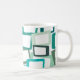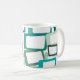 Esta caneca tem uma design moderna do século médio de retângulos mastigados com buracos brancos em tons de azul-esverdeado.