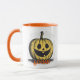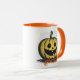 Caneca Retro Halloween com uma ilustração ousada de jack-o'-lantern com estilo de meio-tom vintage e detalhes de personagem divertidos. Um design sazonal festivo perfeito para manhãs de outono, decoração assustadora e momentos de café aconchegantes de outubro. Uma peça divertida e nostálgica para quem ama vibrações clássicas de Halloween.