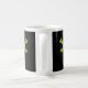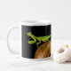 Fotografia de um louva-deus em pé sobre uma bola de madeira sobre fundo preto. Design em ambos os lados da caneca.