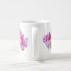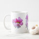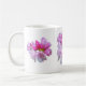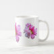 Esta caneca é decorada com três elegantes flores rosa e magenta rododendron.