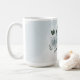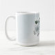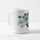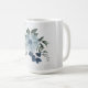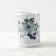 Bela caneca de café botânico com flores românticas brancas, azuis empoeiradas e azuis navais com folhas verdes.