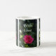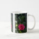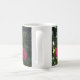 Uma caneca branca com painéis de rosas cor-de-rosa e a inscrição "Com amor". Lavadora de louça e micro-ondas seguras.