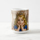 Art mug of a golden-haired girl with a jeweled crown sitting in a beige royal bedroom, blending childhood wonder, grace, and a timeless fairytale mood.