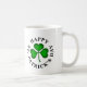 Uma caneca branca com um design verde de trevo irlandês e uma "RUA FELIZ" preta. "O DIA DE PATRICK" escreve em volta.