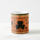 Os shamrocks verdes em um fundo laranja são bordados por flores amarelas nesta linda caneca de Rua. Dia de Patrick. ou qualquer outro dia.