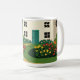A country house with a red roof and smoking chimneys, surrounded by a blooming garden.