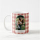 Caneca de Natal russa apresentando um design elegante com sua foto em forma de arco que adiciona um toque moderno ao estilo de vintage do padrão de gingham. Abaixo da sua foto está a saudação editável "Feliz Natal" junto com os seus nomes.