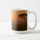 A white coffee mug featuring a funny, photo-realistic image of an elephant dressed in a suit, sitting thoughtfully in an armchair at sunset in the African savanna.
