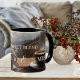 Um café com o tema personalizado Salvar a data ou a caneca do anúncio do casamento com uma pintura de dois copos de café sobre uma paisagem de montanha. Você também pode usar esta caneca para perguntar ao seu melhor homem ou madrinhas. Personalizável também para outras situações.