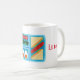 Uma caneca de bebendo durante o almoço apresenta uma lanchonete azul que contém um sanduíche, salsicha, ovo, tomate e brócolis com nome personalizado e cor de fundo. Combine com a mesma design para o lugar, porta copos e guardanapo. Aproveite o seu almoço! #mug #almoço #lunchbox #sandwich #sauswich #blue #ovo #tomato #brocolli #background color #havinglunch