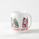 Santa Paws Says Happy Holidays Coffee Mug. A chubby cat lounges beside the glittering Christmas tree, eyes half closed in festive bliss, purring softly as if to say, Happy holidays, may your treats be plenty and naps long.