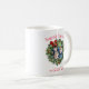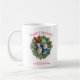 Esta caneca bonita faz um maravilhoso presente de Natal. Apresenta uma design divertida com um quadro de fotos da coroa de feriados onde você pode carregar sua própria foto. A legenda diz "Saudações da Época" e há espaço para uma breve saudação junto com o seu nome.