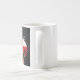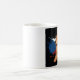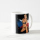 Menina loura "sexy" da lingerie na caneca de café com fundo da bandeira do splatter da pintura