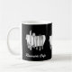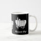 Um nome personalizado ou uma caneca comercial de restaurante com texto branco e um conjunto de pratos de prata em um guardanapo de mesa embelezado em cinzas de fundo preto. Personalize esta design para adicionar seu nome ou logotipo a este produto, altere as cores de fundo e muito mais.