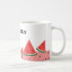Fatias de melancia maduras, frescas, com carne cor-de-rosa, sementes pretas e enxertos verdes escuros num design cor-de-rosa macio ao longo do fundo. A palavra "melancia" pode ser alterada se assim o desejar.