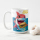 shark mug, funny shark design, ocean animal cup, summer coffee mug, beach vibes mug, shark and food, foodie gift, cartoon shark mug, burger lover gift, sea life drinkware, cute predator illustration, tropical mug, bright colored cup, ocean snack time, marine life humor
