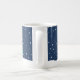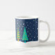 Um moderno design geométrico de cinco árvores de abeto em lacaio, turquesa e ouro amarelo. O céu está marinho com neve branca caindo.