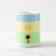 Belíssima caneca com sol e pontos coloridos em listras azuis, amarelas e verdes.