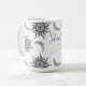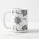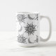 Este é um belo padrão celeste preto e branco que apresenta luas em crescente, flores de mandala, mandala solar, raios solares, padrão de flores, floral e folhas, arte rabiscada, criada com a arte da linha do derrame preto sobre um fundo branco. O padrão tem uma lua mística e fofa e um tema do universo estilo mandala solar.