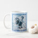 Você pode adicionar um toque único à taça matinal da sua bebida favorita com este design com um frango mosaico em tons de azul e preto.