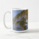 O Sr. e a Sra. praia ou destino do tema do casamento tropical favorece os convidados em texto branco. O fundo tem céu azul com um bonito close-up de três palmeiras com frentes soprando na brisa oceânica. Belas canecas para a noiva e noiva recém-casados. Design de fotografia original por TamiraZDesign. Visite minha loja para ver mais itens originais projetados através de: www.zazzle.com/tamirazdesigns