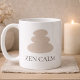 Minimal zen-inspired design featuring a white ceramic surface with a stacked stone icon and refined serif text reading Zen Calm. The clean layout and neutral palette suit modern kitchens, office desks, or morning routines centered on balanced, uncluttered surroundings.