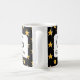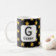Este chá monograma ou caneca de café é uma forma excelente de começar o dia com um toque especial. Um padrão de estrela amarela brilhante aparece contra um fundo preto nesta caneca. O seu monograma e nome aparecem em ambos os lados e são apresentados num quadrado. Esse design minimalista pode ser facilmente personalizado. Design original - C. McGouldrick