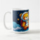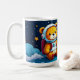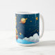 Cute teddy astronaut sitting on soft clouds under a navy night sky with golden stars and dotted star trails—wraparound white ceramic coffee mug.