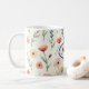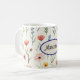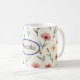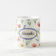 Flores cor-de-rosa, corais, azuis e amarelas atravessam esta caneca. Muito doce e adorável. Personalize com seu nome em um oval azul.