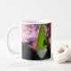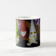 Três gnomos brancos sentam-se sobre um pedaço de madeira no início de uma noite mágica de inverno, suas roupas coloridas contrastam com a silhueta escura das árvores sem folhas durante o pôr do sol. Gnomos feitos à mão e fotografia do pôr do sol de inverno em Ohio pelo artista Liz Viztes.