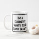 Um slogan engraçado numa caneca de café que diz "Sou um Clarinetista. Qual é o seu super talento?" Café Mug para um Clarinetista ou alguém que toca clarinete. Texto preto e branco em negrito.