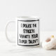 Um slogan engraçado numa caneca que diz "Eu policio as ruas. Qual é o teu super talento?" Mug para um policial, policial ou membro da força policial. Texto preto e branco em negrito.