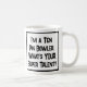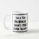Um slogan engraçado numa caneca que diz "Sou um Tin Bowler. Qual é o seu super talento?" Uma caneca para 10 pinos. Texto preto e branco em negrito.