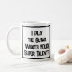 Slogan engraçado do tocador de violão em uma caneca de café que diz "Eu toco violão. Qual é o seu super talento?" Coffee Mug para um guitarrista ou guitarrista. Texto preto e branco em negrito.