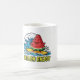Uma fatia de melancia feliz cavalga as ondas numa prancha, trazendo vibrações sobre o verão e a fruição