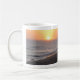 Surfistas ficam na costa da Praia de Huntington, Califórnia, prontos para remar ao pôr do sol.