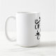 The centerpiece of this design is the empowering mantra "CAFFEINATE AND CONQUER," rendered in a playful yet sophisticated black serif font. The layout is balanced by charming coffee-themed illustrations, including two steaming cups of coffee on saucers and a decorative coffee bean flourish at the top with elegant swirls.