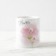A taça apresenta um delicado design cerâmico branco adornado com uma ilustração floral. A ilustração consiste em duas flores num solteiro, contra um fundo rosa macio. A palavra "Flor" é escrita por cima da ilustração com uma letra cursiva, na moda, acrescentando à estética simples e elegante da xícara.