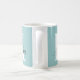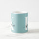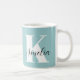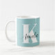 Uma caneca azul teal personalizada que apresenta seu monograma inicial em uma tipografia branca moderna e grande e seu nome em um script de assinatura de caligrafia na moda.