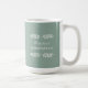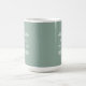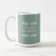 Esta caneca de café de 15 oz de tamanho superior apresenta a expressão, "Pratique o pensamento", com um simples design de texto preto sobre um fundo verde empoeirado com ramos de marfim.