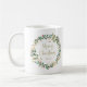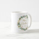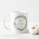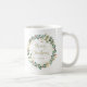 Esta simples e na moda, caneca, apresenta uma coroa de aquarelas impressionante com folhas verdes e falsas de ouro e groselhas vermelhas, e uma tipografia de escrituras douradas modernas que diz "Feliz Natal" em fundo branco.