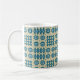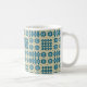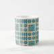 Uma caneca de café branco chique, com um bordo e um punho azul brilhante e um teste padrão de motivos tradicionais da tapeçaria de Galês nos azuis marinhos em um fundo do Sable. Este teste padrão caberá todos os tamanhos da caneca.