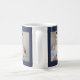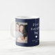 Esta simples caneca de fotos de Dia de os pais azul e branco pela primeira vez que o pai apresenta um fundo azul escuro e marinho com tipografia de texto de máquina de escrever branca que diz "Primeiro Dia de os pais". Adicione duas fotos do novo papai e do bebê, com espaço para personalizar com nomes e anos.