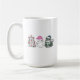 Three adorable cartoon cats are dressed up for Christmas. One is tangled in lights and ornaments, one wears a pink Santa hat, and another is wrapped in green string lights with a blue Santa hat.