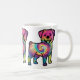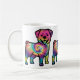 Este trabalho de arte retrata um cão Rottweiler com um padrão de pele de corante de gravata. O design brilhante e colorido adiciona uma reviravolta única ao visual clássico do Rottweiler. O efeito gravata também representa um senso de diversão e individualidade.