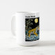 Um estilo de arte ukiyo-e que mostra um tigre atravessando um rio à noite. A lua e as estrelas estão iluminando seu caminho.