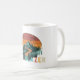Um design de caneca com a palavra "Trailblazer" em gradiente colorido, com uma cordilheira e uma trilha sinuosa no fundo. A design simboliza o espírito aventureiro de um pioneiro.
