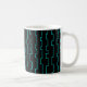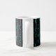Esta caneca tem uma design de linhas moderna do século médio com meias retângulos em turquesa num campo de preto.